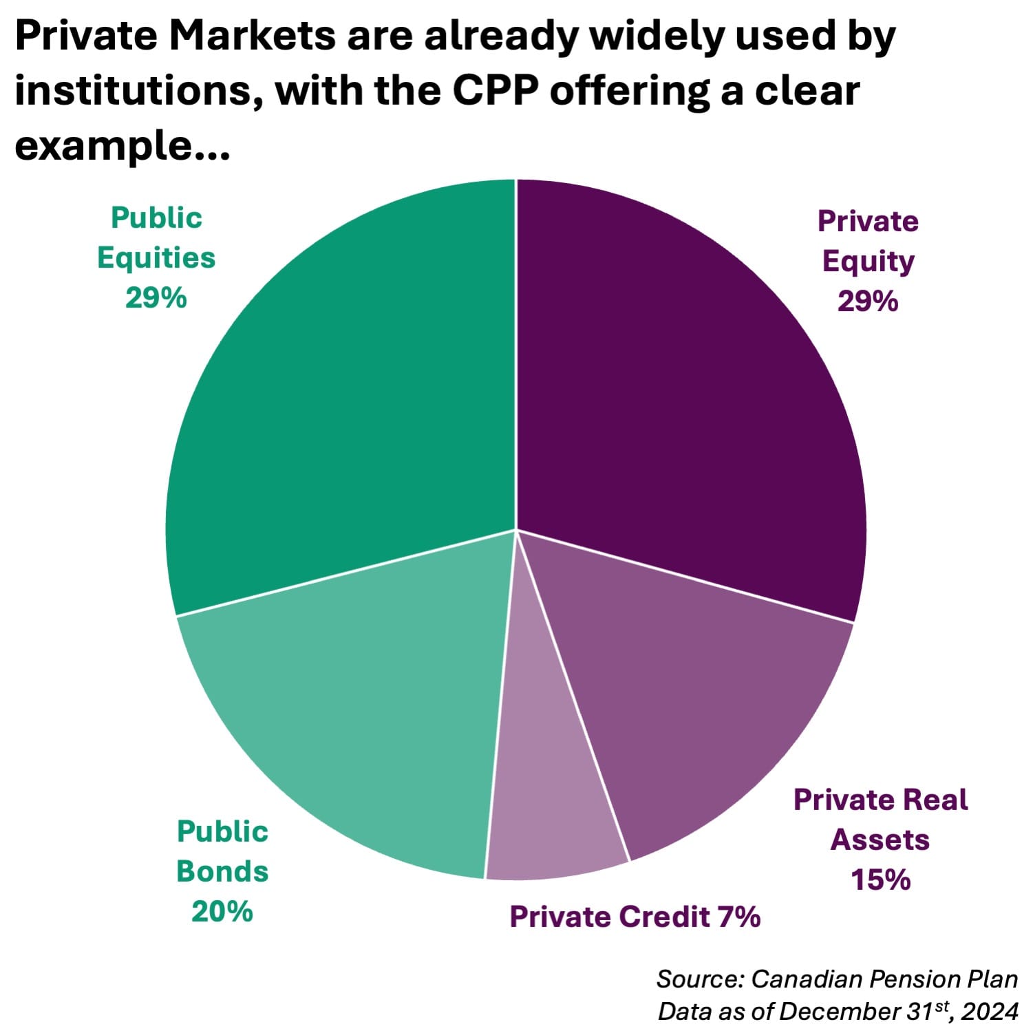 Private markets remain unfamiliar to most individual investors, but institutions have relied on them for decades. The Canada Pension Plan is a perfect case in point, with approximately half of its portfolio in private markets.