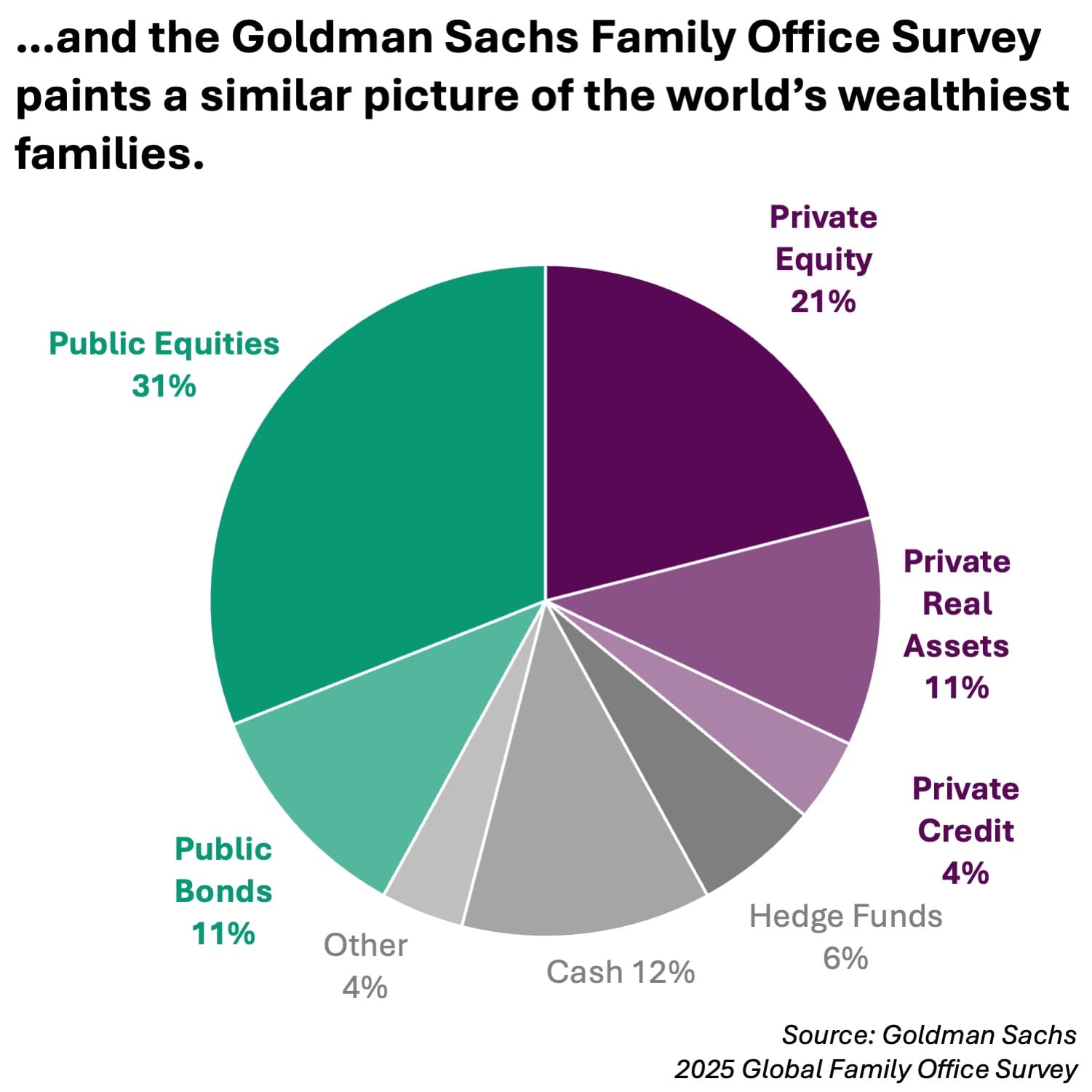 Likewise, surveys of family offices show that the world's wealthiest families commit a roughly equal portion of their savings to public and private markets. So it's no surprise private markets are drawing more attention from individuals. After all, goals like building wealth, managing risk, preserving assets for future generations, and generating income aren’t exclusive to the ultra-wealthy; they’re shared by everyone.