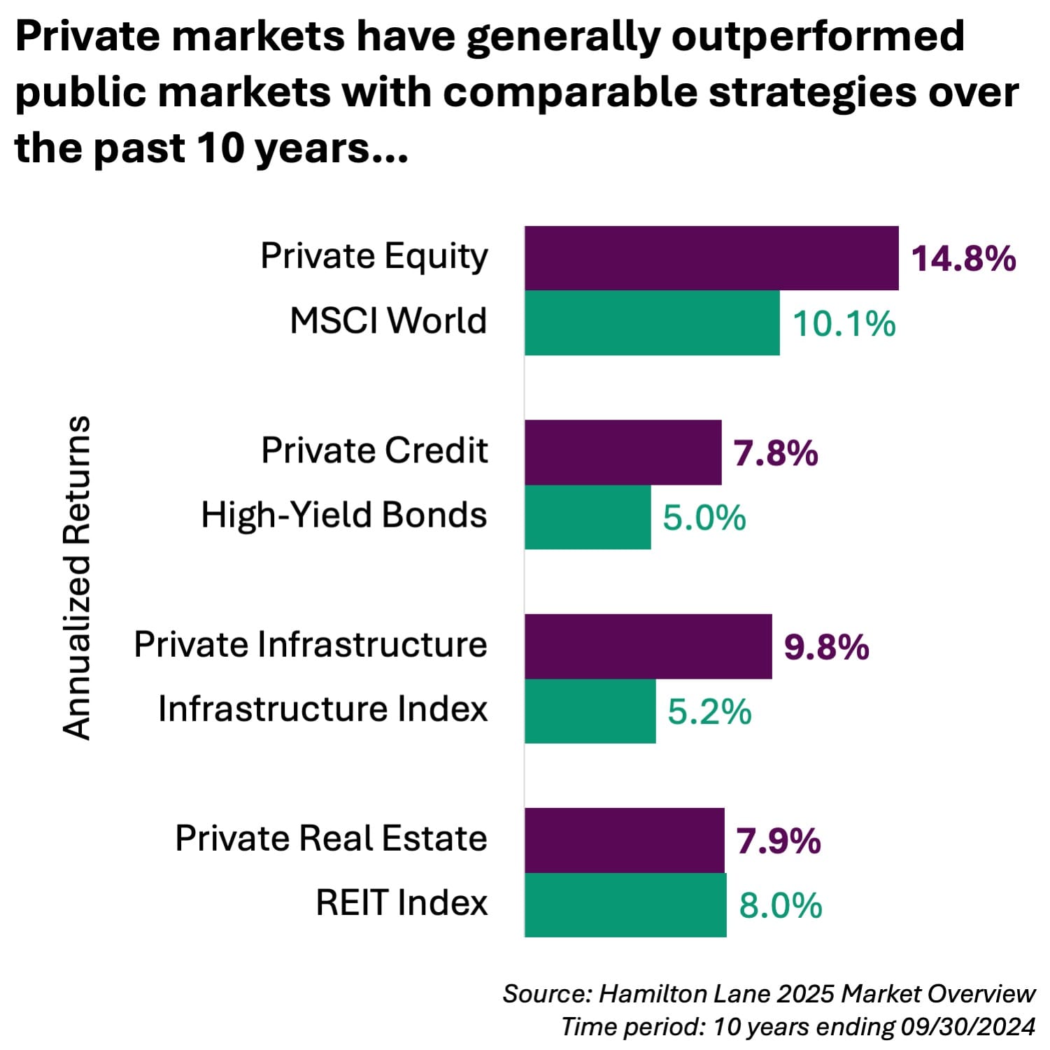 Numerous studies have compared the performance of public and private investment strategies, and the results are remarkably consistent: private markets come out ahead. For instance, Hamilton Lane has shown a clear edge for private markets, with the exception of real estate, which is more or less a draw. Several factors explain this. Unlike public companies, private firms aren’t as constrained by short-term pressures, and research shows they grow revenue and profits faster than their public peers. They are also often acquired at lower valuation multiples, partly because fewer buyers compete for each deal. This advantage extends across private credit and infrastructure as well. The tradeoff is (a lack of) liquidity. But for investors with a long-term horizon, giving up liquidity is a compromise worth making, just as institutions have long recognized.