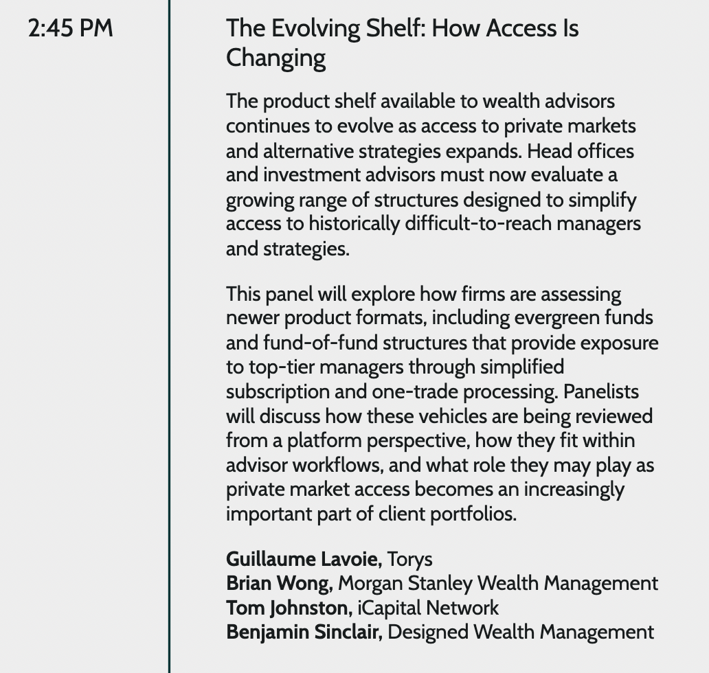 For this year's event, I was invited to speak on a panel at 2:45pm with Tom Johnston of iCapital (who was also on the panel with me at the CAIA event), Guillaume Lavoie from Torys, and Brian Wong from Morgan Stanley. So if anyone is going to this event, I'll see you there. And if anyone wants to make some last-minute plans, the event is at the Toronto Board of Trade at 100 Queens Quay East.