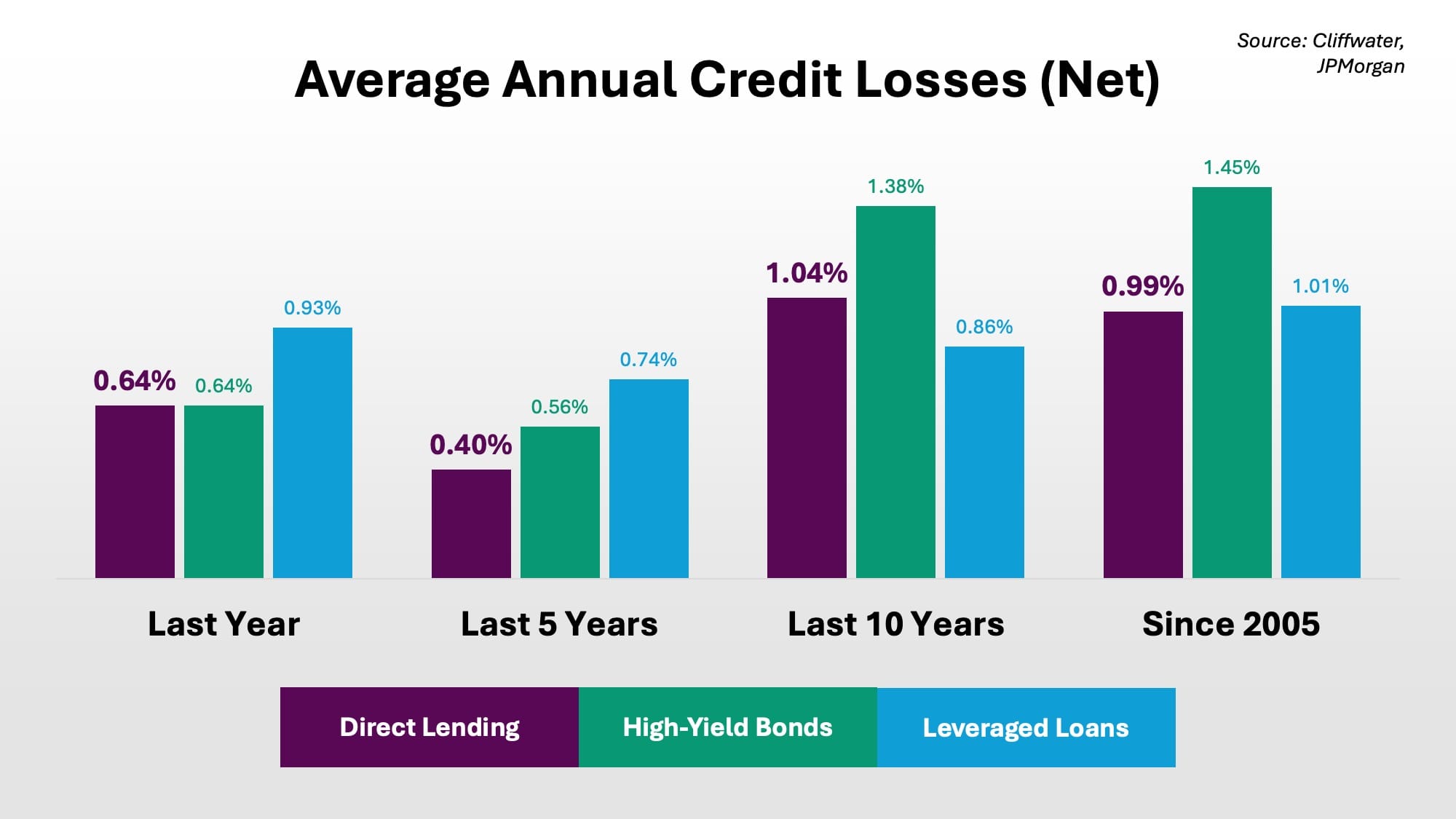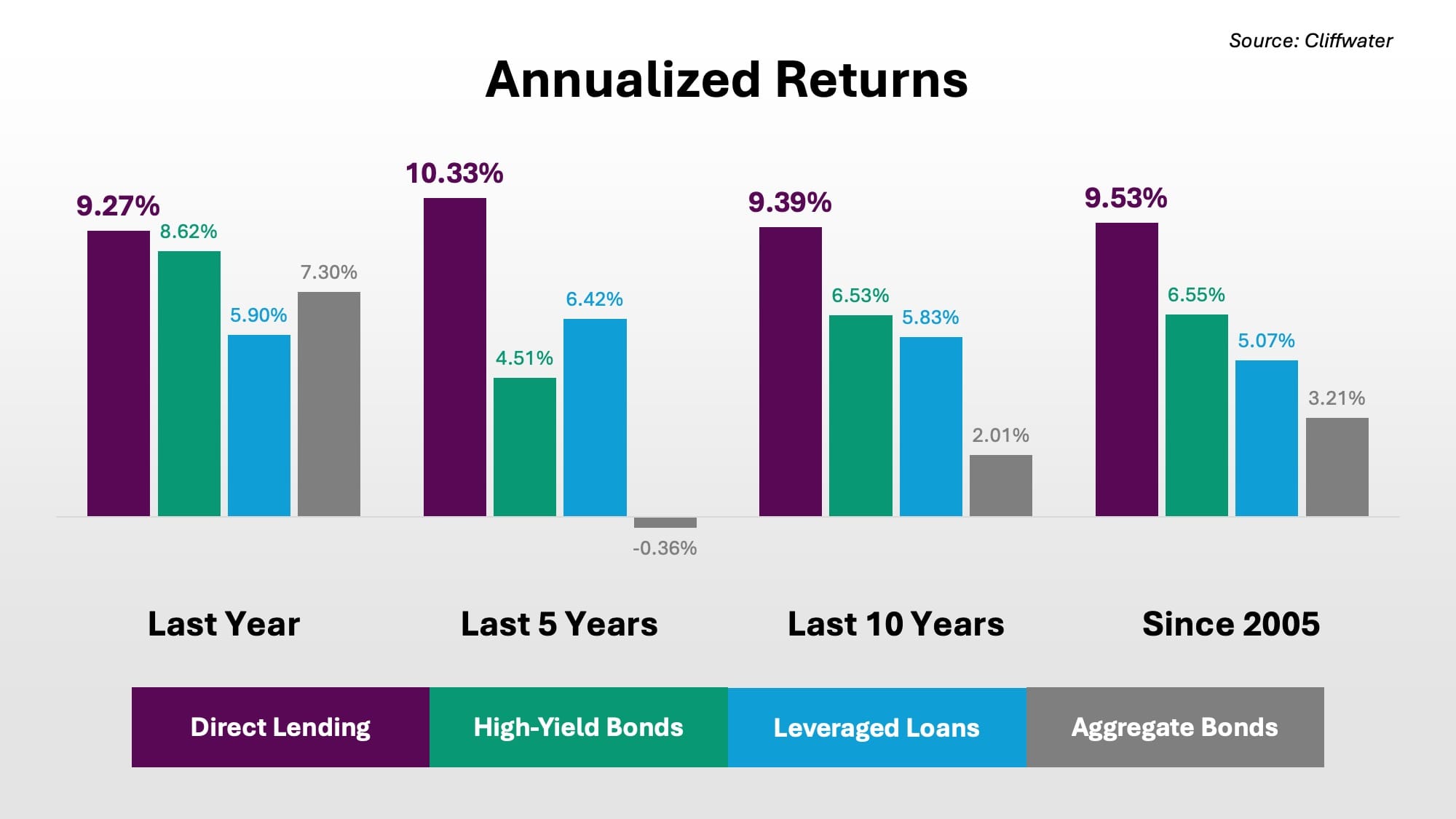 But all the while, investment performance in the space has remained solid. In 2025, the Cliffwater Direct Lending Index (CDLI) once again outperformed high-yield bonds, leveraged loans, and the bond index as a whole. When looking back over longer timeframes, again Direct Lending has performed much better than comparable strategies.