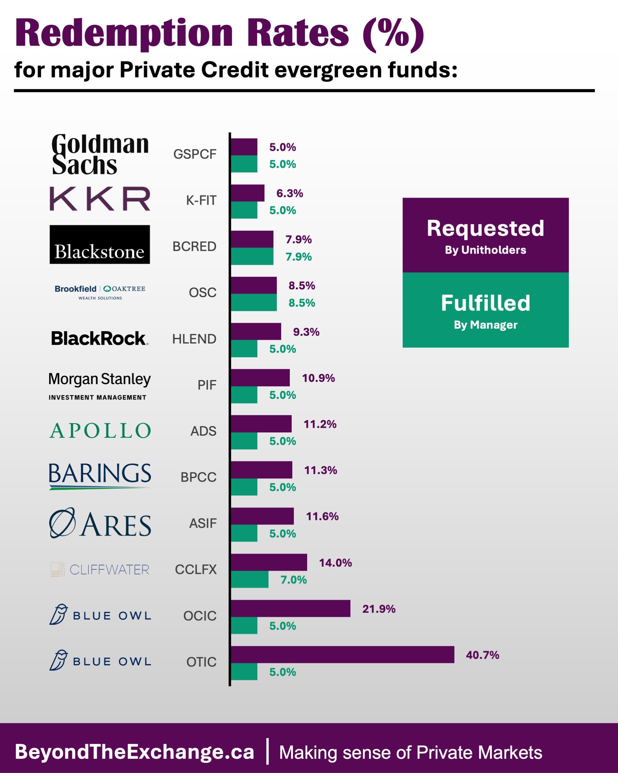 Speaking of Private Credit, for those of you unaware, there has been a wave of redemption requests in the space. And only a handful of firms have met these requests in full. The final firms (including Blue Owl) reported last week, and the numbers aren't particularly flattering: