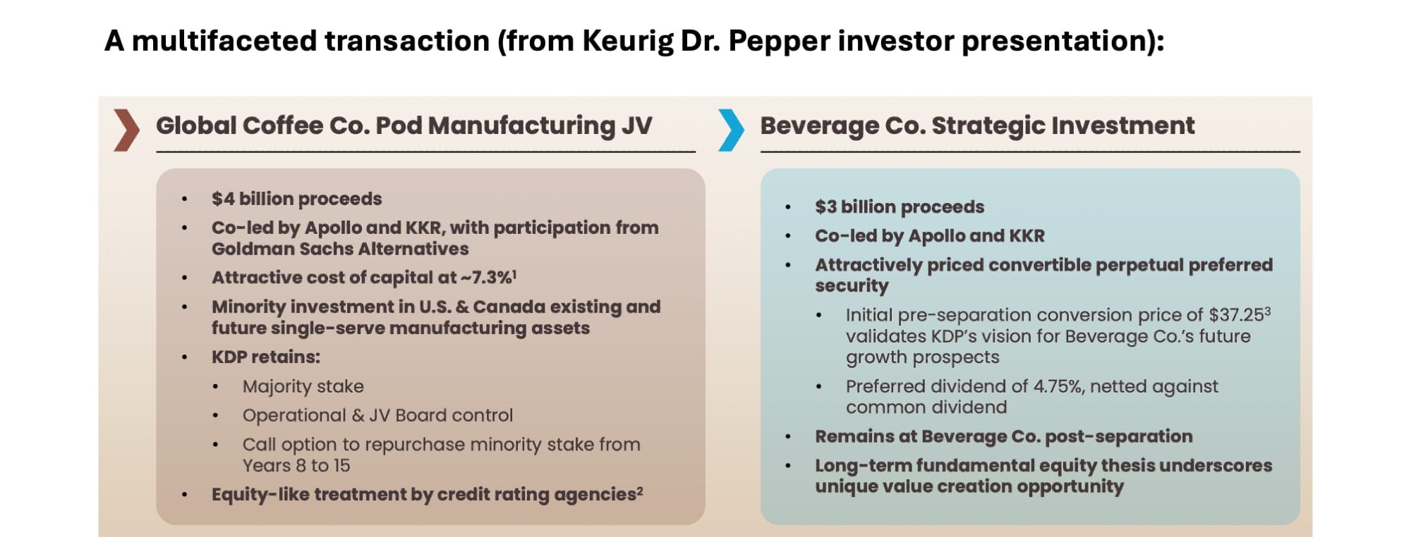 On Monday last week, Keurig Dr Pepper (KDP) announced a $7 billion investment led by KKR and Apollo, but this was not a cookie-cutter deal. On the contrary, the transaction stands out because it showcases how private markets can offer flexible capital solutions that traditional banks and public markets cannot provide. Rather than a simple equity or debt issuance, this was a customized financing structure designed to meet a specific need for KDP and its shareholders.